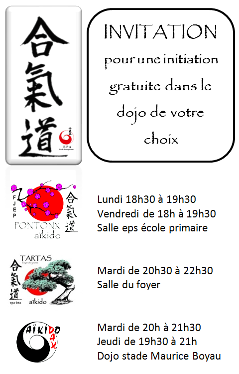 Le meilleur moyen de découvrir l’Aïkido c’est encore de venir essayer. Une invitation d’initiation et découverte est disponible ci dessus et valable pour les trois dojos, gratuitement pour 2 séances. Il suffit de se présenter dans le dojo de votre choix muni de cette invitation et de vous laisser guider. N’hésitez pas, l’invitation est valable jusqu’au mois de janvier !!!